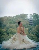 纱裙作为造型的核心,选用轻盈通透的材质,多层薄纱叠加出朦胧的层次感,行走间裙摆随风轻扬,飘逸如云。裙身精致的刺绣是点睛之笔——